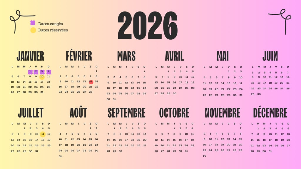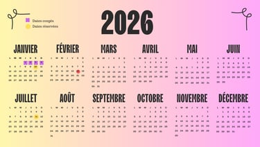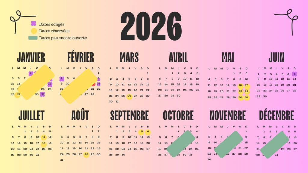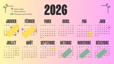 Ouverture de l'agenda 2026. Les dates avec un cercle jaunes sont celles réservées et avec un acompte.