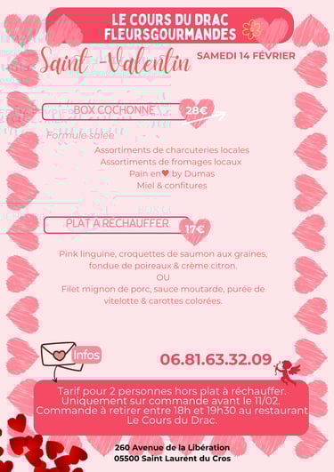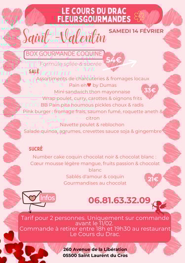 C'est la page à suivre! Que ce soit pour des soirées au Ride Café, des soirées pour prendre à emporter, en passant par les propositions de Noël, des marchés, des événements éphémères, des fêtes et l'événement préféré de Fleurs Gourmandes : la SAINT VALENTIN !