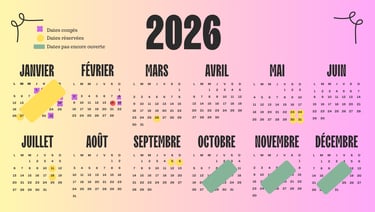 Ouverture de l'agenda 2026. Les dates avec un cercle jaunes sont celles réservées et avec un acompte.